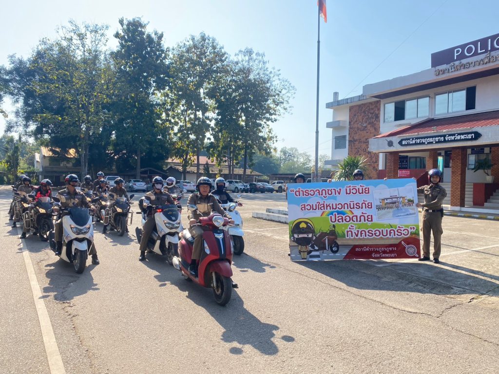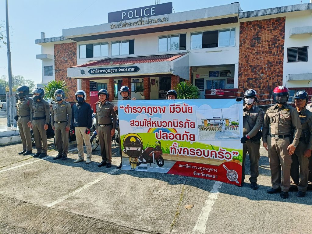 พ.ต.ท.สุพนธ์ มีจิตร สวป.สภ.ภูซางและข้าราชการตำรวจ สภ.ภูซาง อ.ภูซาง จ.พะเยา จัดกิจกรรมและประชาสัมพันธ์รณรงค์สวมใส่หมวกนิรภัยขณะขับขี่รถจักรยานยนต์บนถนน ในโครงการ “ตำรวจภูซาง มีวินัยสวมหมวกนิรภัย ปลอดภัยทั้งครอบครัว”