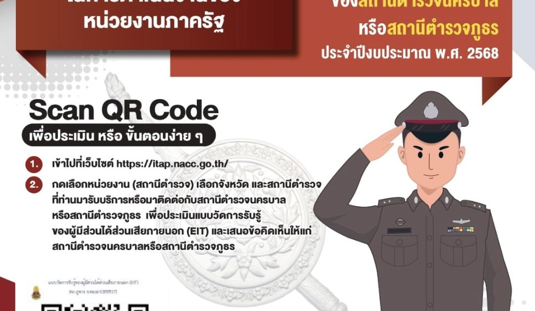 ขอเชิญชวน ประชาชนผู้มารับบริการบนสถานีตำรวจ ร่วมประเมินแบบวัดการรับรู้ผู้มีส่วนได้ส่วนเสียภายนอก(EIT)ของสภ.ภูซาง ประจำปีงบประมาณ พ.ศ.2568