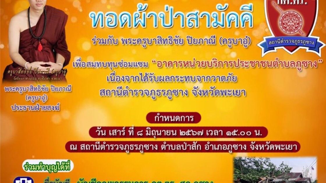 ขอเชิญร่วมเป็นเจ้าภาพ ทอดผ้าป่าสามัคคี ร่วมกับ พระครูบาสิทธิชัย ปิยภาณี(ครูบาอู๋) เพื่อซ่อมแซม อาคารหน่วยบริการประชาชนตำบลภูซาง เนื่องจากได้รับผลกระทบจากวาตภัย ในวันเสาร์ที่ 8 มิถุนายน 2567 ณ สถานีตำรวจภูธรภูซาง หรือร่วมทำบุญได้ที่ ชื่อบัญชี บัญชีคณะกรรมการ กต.ตร.สภ.ภูซาง เลขที่ 020232857731 (ธ.ก.ส.)