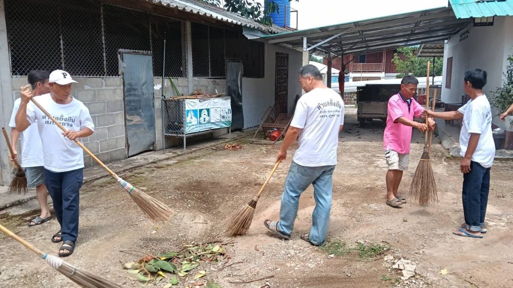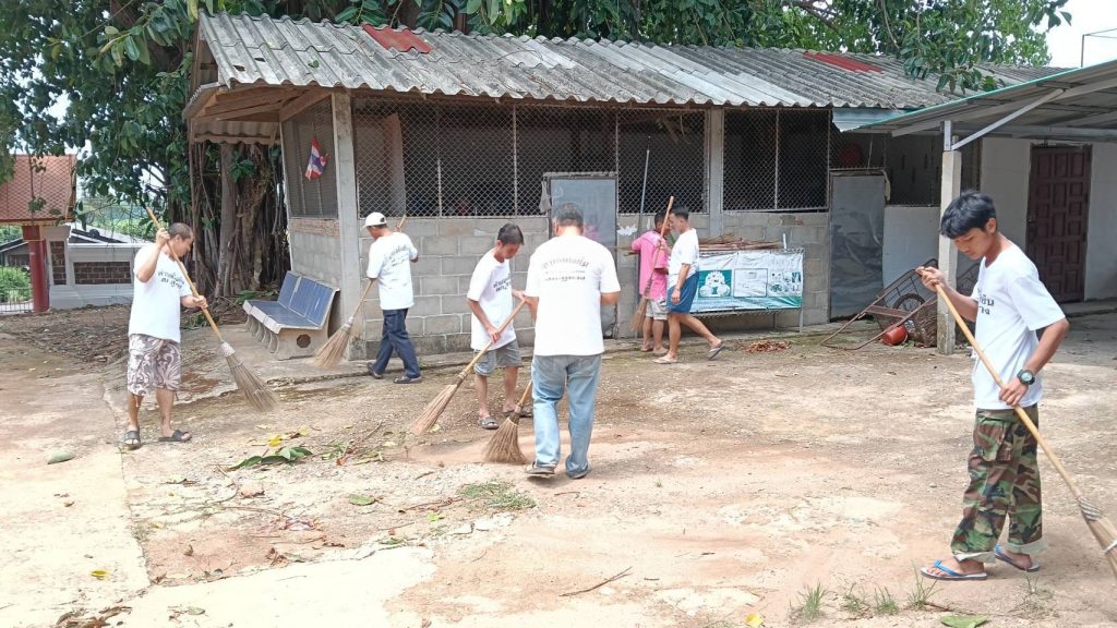 – ดำเนินการกิจกรรมบำบัดโดยชุดปฏิบัติการพร้อมภาคีเครือข่ายนำผู้เข้าร่วมโครงการทำกิจกรรมบำเพ็ญประโยชน์ต่อสาธารณะ ทำความสะอาด เก็บกวาดขยะบริเวณลานวัดทุ่งติ้ว หมู่ 6 ต.ภูซาง