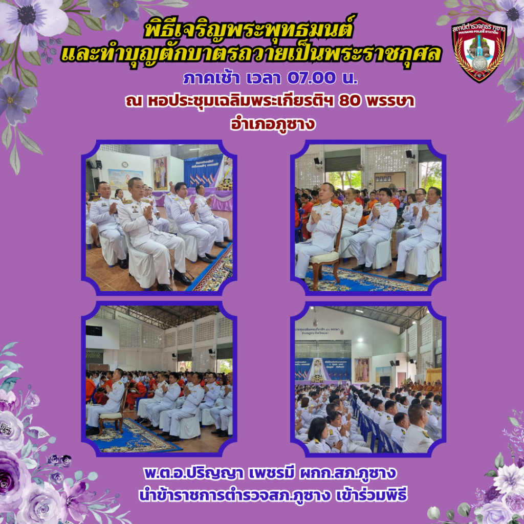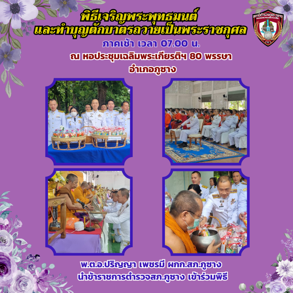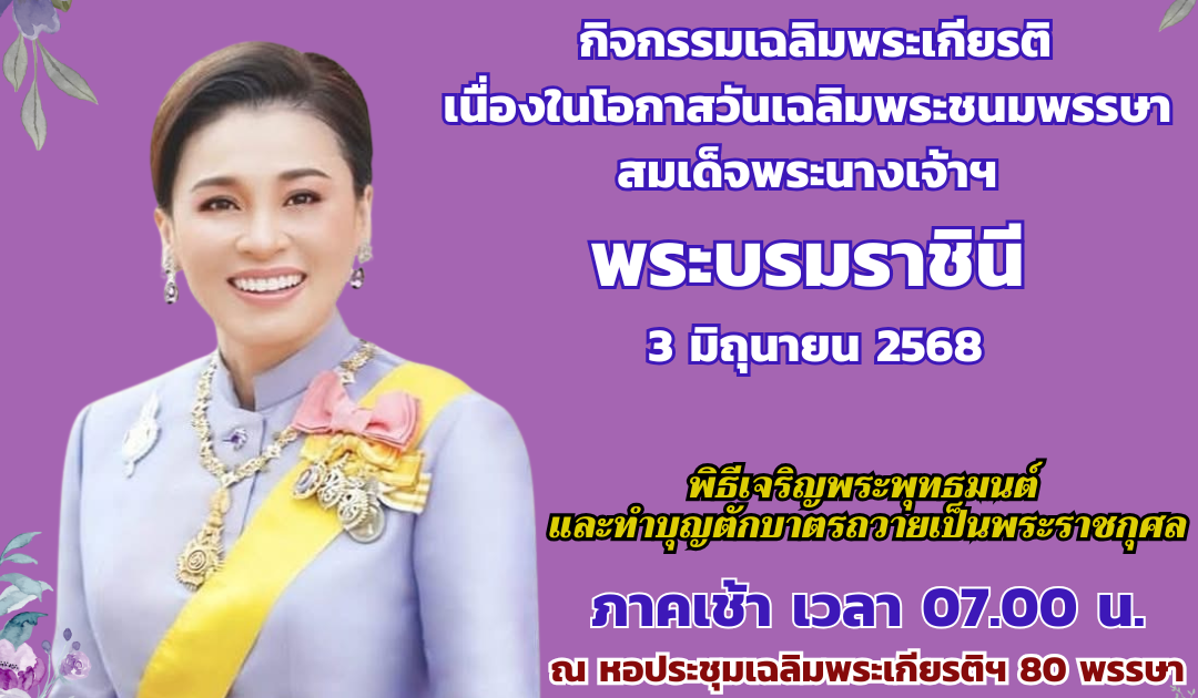 พิธีเจริญพระพุทธมนต์ และทำบุญตักรบาตรถวายเป็นพระราชกุศล เนื่องในโอกาสวันเฉลิมพระชนมพรรษา สมเด็จพระนางเจ้าฯ พระบรมราชินี 3 มิถุนายน 2568 ณ หอประชุมเฉลิมพระเกียรติ 80 พรรษา อำเภอภูซาง