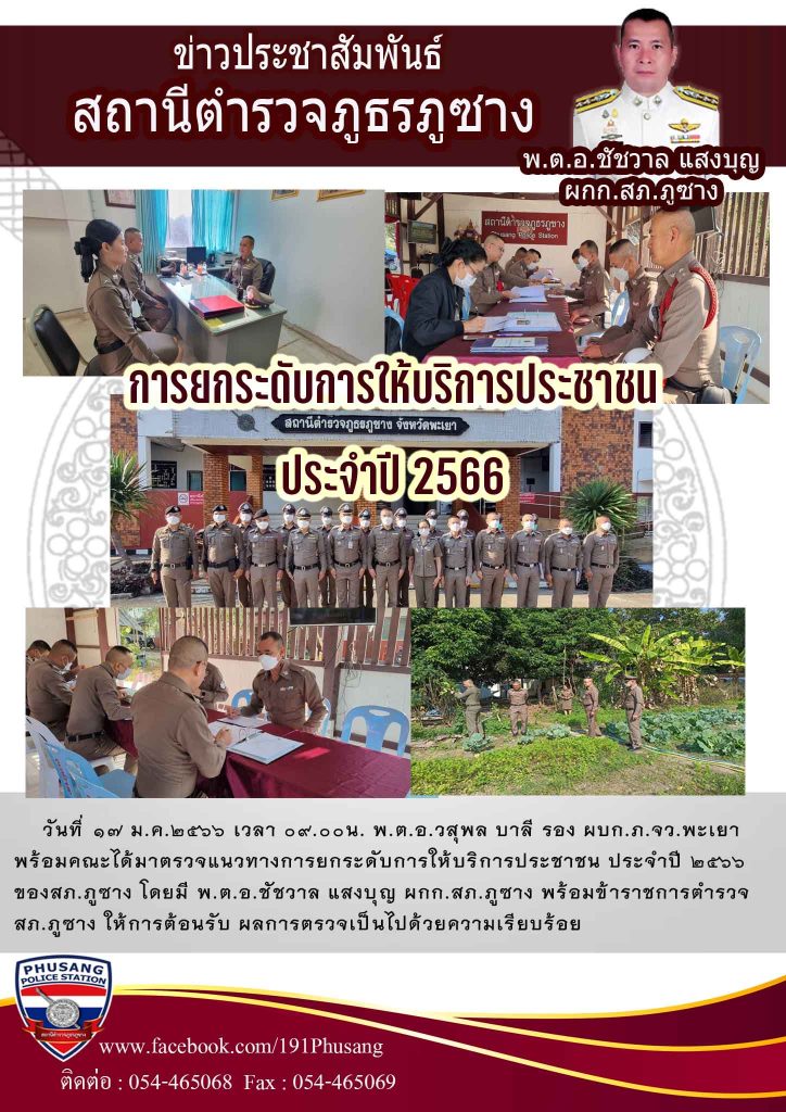 วันที่ 17 ม.ค.2566 เวลา 09.00น. พ.ต.อ.วสุพล บาลี รอง ผบก.ภ.จว.พะเยา พร้อมคณะได้มาตรวจแนวทางการยกระดับการให้บริการประชาชน ประจำปี 2566 ของสภ.ภูซาง โดยมี พ.ต.อ.ชัชวาล แสงบุญ ผกก.สภ.ภูซาง พร้อมข้าราชการตำรวจ สภ.ภูซาง ให้การต้อนรับ ผลการตรวจเป็นไปด้วยความเรียบร้อย