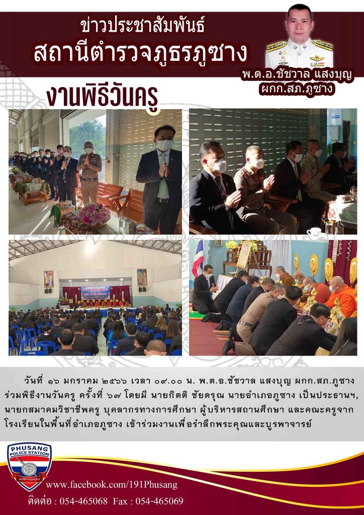 วันที่ 16 มกราคม 2566 เวลา 09.00 น. พ.ต.อ.ชัชวาล แสงบุญ ผกก.สภ.ภูซาง ร่วมพิธีงานวันครู ครั้งที่ 67 โดยมี นายกิตติ ชัยดรุณ นายอำเภอภูซาง เป็นประธานฯ, นายกสมาคมวิชาชีพครู บุคลากรทางการศึกษา ผู้บริหารสถานศึกษา และคณะครูจากโรงเรียนในพื้นที่อำเภอภูซาง เข้าร่วมงานเพื่อรำลึกพระคุณและบูรพาจารย์ เพื่อแสดงความกตัญญูกตเวที ณ หอประชุมโรงเรียนภูซางวิทยาคม อำเภอภูซาง จังหวัดพะเยา