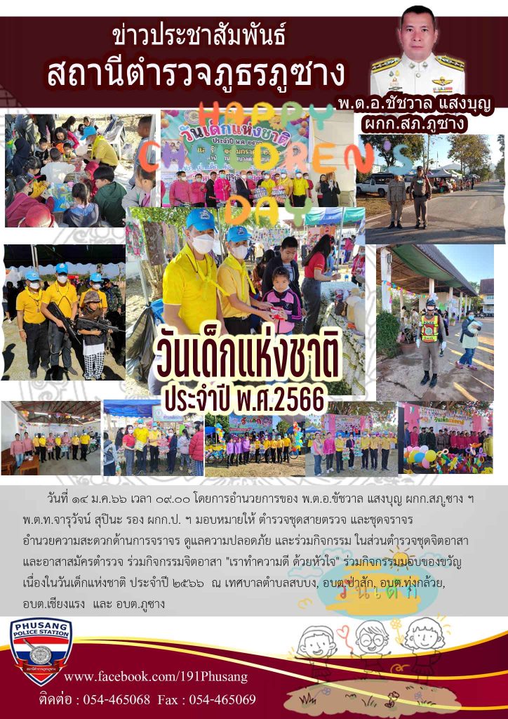 วันที่ 14 ม.ค.66 เวลา 09.00 โดยการอำนวยการของ พ.ต.อ.ขัชวาล แสงบุญ ผกก.สภ.ูซาง ฯ พ.ต.ท.จารุวัจน์ สุปินะ รอง ผกก.ป. ฯ มอบหมายให้ ตำรวจชุดสายตรวจ และชุดจราจร อำนวยความสะดวกด้านการจราจร ดูแลความปลอดภัย และร่วมกิจกรรม ในส่วนตำรวจชุดจิตอาสา และอาสาสมัครตำรวจ ร่วมกิจกรรมจิตอาสา "เราทำความดี ด้วยหัวใจ" ร่วมกิจกรรมมอบของขวัญ เนื่องในวันเด็กแห่งชาติ ประจำปี 2566 ณ เทศบาลตำบลสบบง, อบต.ป่าสัก, อบต.ทุ่งกล้วย, อบต.เชียงแรง และ อบต.ภูซาง