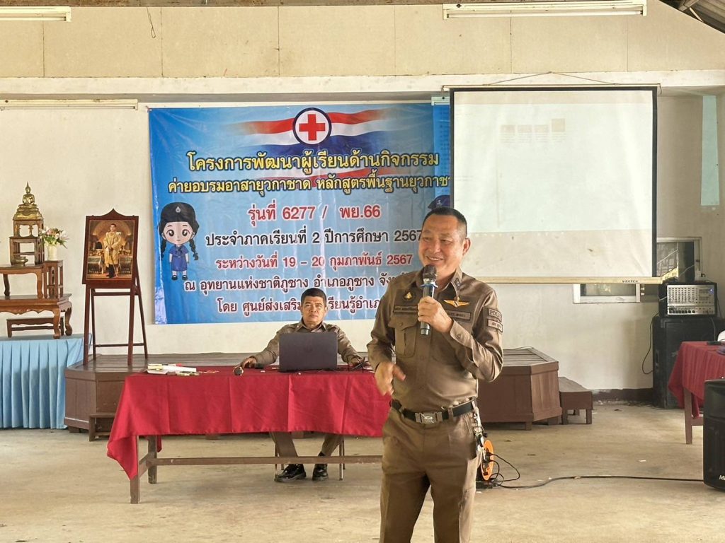 วันนี้ 20 ก.พ. 2567 เวลา 13.30 น. โดยการอำนวยการของ พ.ต.อ.ทีฆวุฒิ บัณฑิตชูสกุล ผกก.สภ.ภูซาง พ.ต.ท.จารุวัจน์ สุปินะ รอง.ผกก.ป.สภ.ภูชาง พ.ต.ท.สุพนธ์ มีจิตร สวป.สภ.ภูซาง มอบหมายให้ ร.ต.อ.อุทัย วงศ์ใหญ่ รอง สวป.(ชส.) สภ.ภูซาง พร้อมชุด ชมส.สภ.ภูซาง เป็นวิทยากรฝึกอบรมโครงการ พัฒนาผู้เรียนด้านกิจกรรม ค่ายอบรมอาสายุวกาชาด หลักสูตรพื้นฐานยุวกาชาด รุ่นที่ 6277/ พย. 66 ประจำภาคเรียนที่ 2 ปีการศึกษาที่ 2567 ณอุทยานแห่งชาติภูซางอำเภอภูซางจังหวัดพะเยา โดยศูนย์ส่งเสริมการเรียนรู้ อำเภอภูซาง มีผู้เข้ารับการฝึกอบรม จำนวน 40 คน