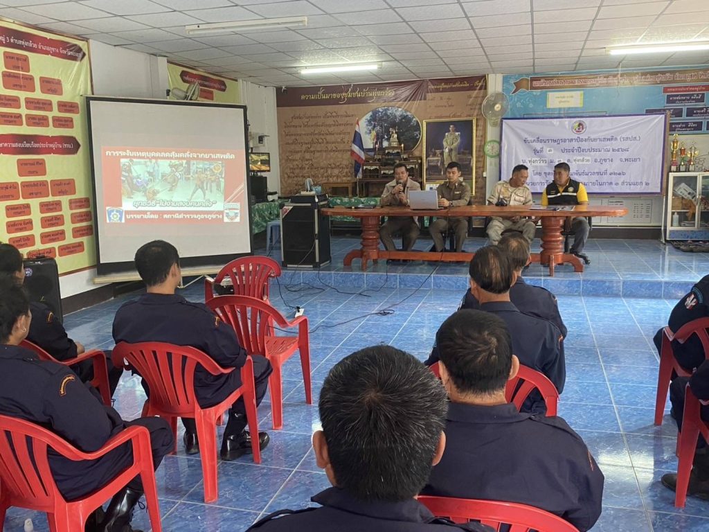 เป็นวิทยากรบรรยายให้ความรู้ในเรื่องการระงับเหตุบุคคลคุ้มคลั่งและเตือนภัยออนไลน์ ให้กับผู้ที่เข้าร่วมการฝึกอบรม โครงการขับเคลื่อนราษฎรอาสาป้องกันยาเสพติด รุ่นที่ 3 ณ ศาลากองทุนหมู่บ้าน บ้านทุ่งกว๋าว ม.3 ต.ทุ่งกล้วย อ.ภูซาง จ.พะเยา