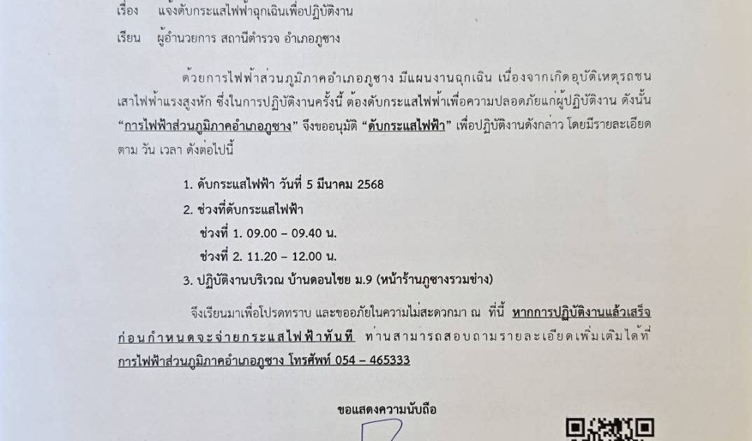 แจ้งประชาสัมพันธ์ การไฟฟ้าอำเภอภูซาง จะดับกระแสไฟฟ้า ช่วงเวลา 09.00-09.40น.และ 11.20-12.00น.ผู้มาติดต่อราชการหรือมารับบริการบนสถานีตำรวจ อาจจะไม่ได้รับความสะดวก