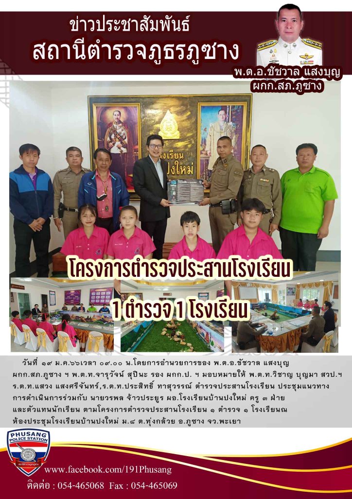วันที่ 19 ม.ค.66 เวลา 09.00 น.โดยการอำนวยการของ พ.ต.อ.ขัชวาล แสงบุญ ผกก.สภ.ภูซาง ฯ, พ.ต.ท.จารุวัจน์ สุปินะ รอง ผกก.ป. ฯ มอบหมายให้ พ.ต.ท.วิชาญ บุญมา สวป.ฯ, ร.ต.ท.แสวง แสงศรีจันทร์, ร.ต.ท.ประสิทธิ์ ทาสุวรรณ์ ตำรวจประสานโรงเรียน ประชุมแนวทางการดำเนินการร่วมกับ นายวรพล จ้าวประยูร ผอ.โรงเรียนบ้านปงใหม่ ครู 3 ฝ่าย และตัวแทนนักเรียน ตามโครงการตำรวจประสานโรงเรียน 1 ตำรวจ 1 โรงเรียน ณ ห้องประชุมโรงเรียนบ้านปงใหม่ ม.8 ต.ทุ่งกล้วย อ.ภูซาง จว.พะเยา