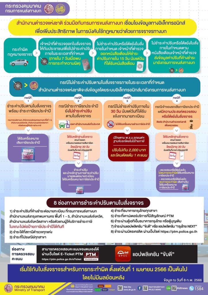 ผู้ขับขี่ที่มีใบสั่งค้างชำระ ซึ่งพบการกระทำผิด ตั้งแต่วันที่ 1 เมษายน 2566 เป็นต้นไป ( ไม่มีผลย้อนหลัง ) เมื่อไปต่อภาษีรถยนต์ประจำปี นายทะเบียนรถยนต์จะไม่ออกเครื่องหมายแสดงการเสียภาษีประจำปี หรือ ป้ายภาษี ให้