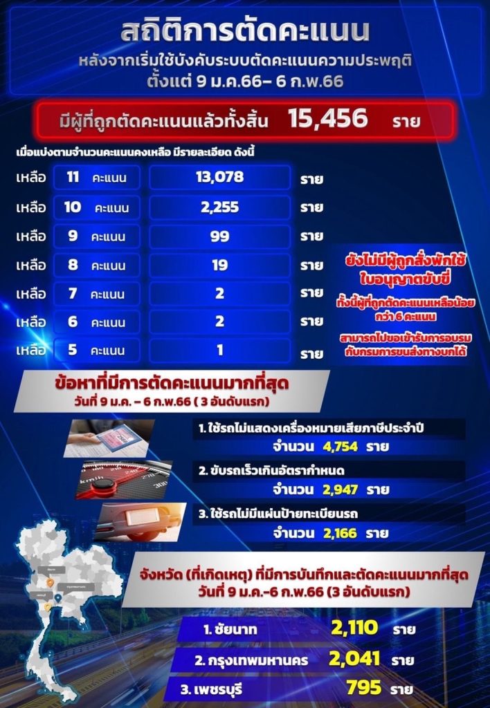 มาตรการที่ 1 การตัดคะแนนความประพฤติ ซึ่งได้เริ่มดำเนินการไปตั้งแต่ 9 มกราคม 2566 ที่ผ่านมา ซึ่งมีผู้กระทำผิดกฎจราจรและถูกตัดคะแนนแล้ว จำนวน 15,456 ราย