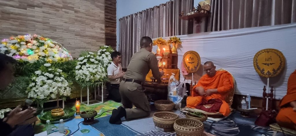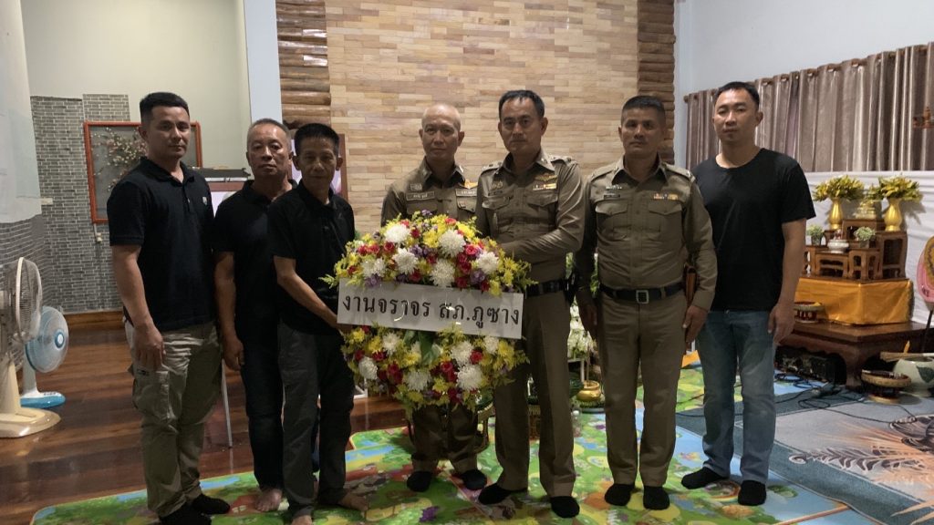 ร่วมงานวางพวงหรีดเคารพศพและสวดพระอภิธรรมศพ แม่คำเกี้ยว การะยศ มารดา ร.ต.ต.กษณะ การะยศ รอง สว(ป.)สภ.ภูซาง
