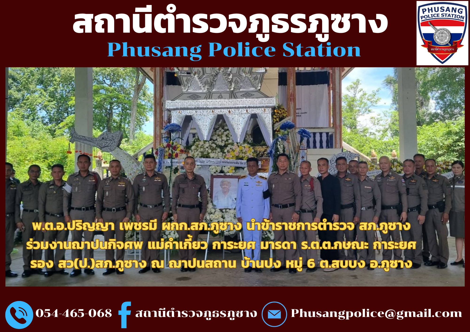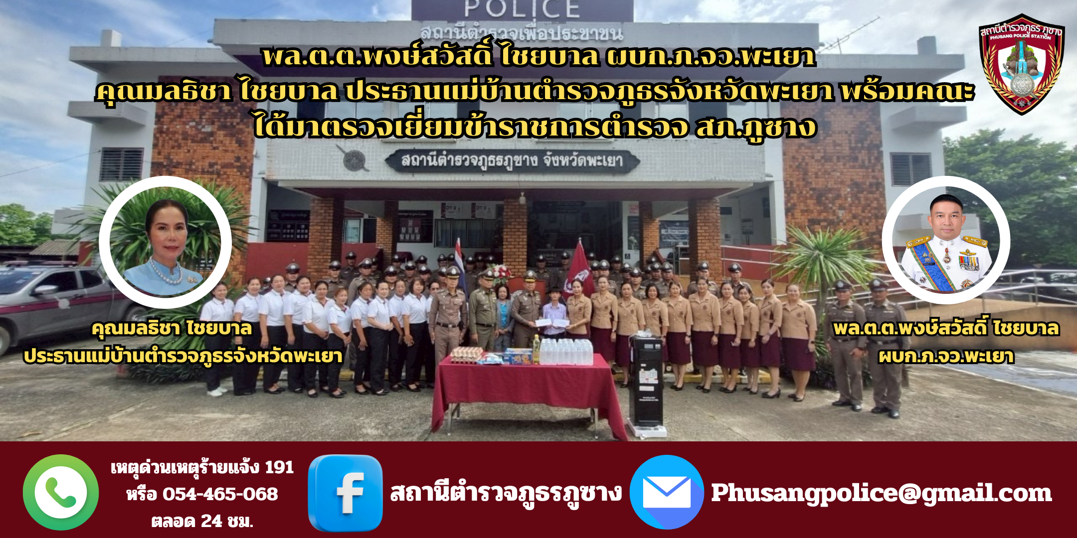 พล.ต.ต.พงษ์สวัสดิ์ ไชยบาล ผบก.ภ.จว.พะเยา,พ.ต.อ.จิรภัทร มุ่งดี รอง ผบก.ภ.จว.พะเยา พร้อมด้วยคุณมลธิชา ไชยบาล ประธานแม่บ้านตำรวจภูธรจังหวัดพะเยา พร้อมคณะ,เจ้าหน้าที่สหกรณ์ออมทรัพย์ตำรวจภูธรจังหวัดพะเยา จำกัด ได้มาตรวจเยี่ยมและมอบสิ่งของบำรุงขวัญและกำลังใจให้กับข้าราชการตำรวจ สภ.ภูซาง พร้อมครอบครัว มอบทุนการศึกษาให้ับุตรข้าราชการตำรวจ มอบสิ่งอำนวยความสะดวกให้กับ สภ.ภูซาง มอบเสื้อกีฬาให้กับสมาชิกสหกรณ์ออมทรัพย์ตำรวจภูธรจังหวัดพะเยา จำกัด ทุกนาย และมอบสิ่งของบำรุงขวัญให้กับข้าราชการตำรวจ(บำนาญ)ที่อยู่ในพื้นที่อำเภอภูซาง